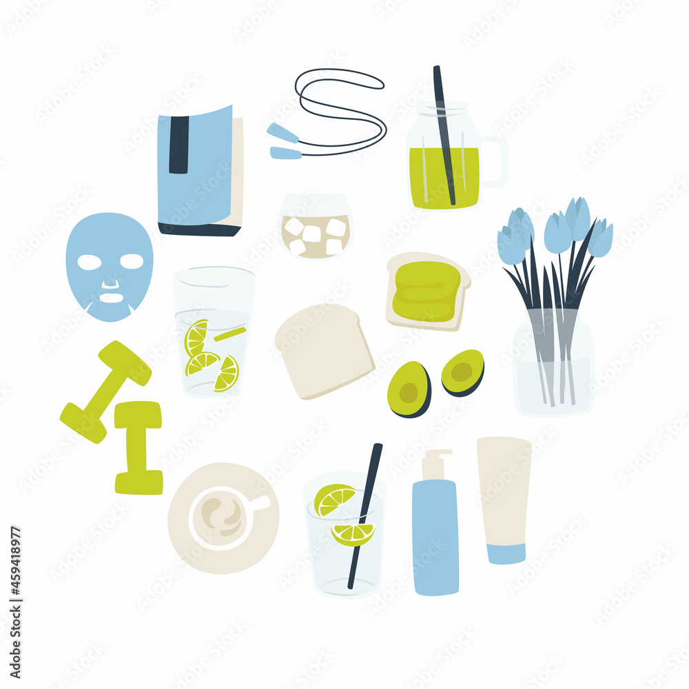 "That Girl" Morning Routine. Every day self care. Aesthetic Healthy habits set. Sport, breakfast, reading, skincare etc. #459418977