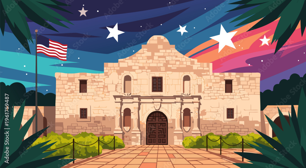 The Alamo Mission in San Antonio, Texas A Vibrant Vector Illustration Celebrating History Under a Starry Sky #1961759487