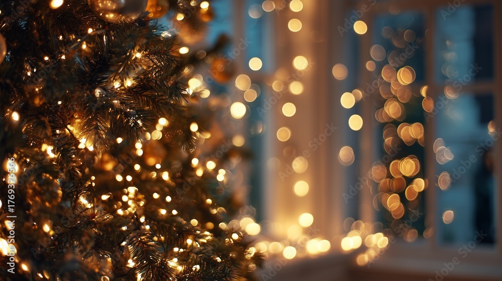 The beautiful Christmas tree is adorned with glowing lights, creating a warm, inviting atmosphere. The glowing lights on the Christmas tree bring joy to the cozy room during the ho #1769326566