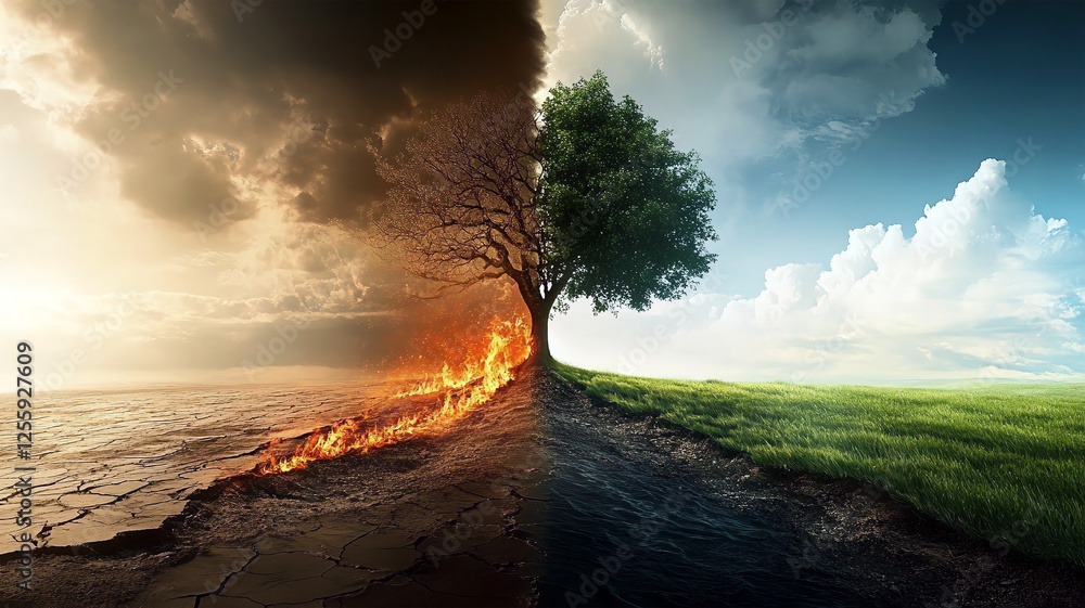 The clash of fire and green reflects global warming and climate change. Earth's ecology, global warming, dramatic environmental shifts, profound impact #1255927609