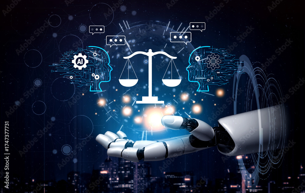 The debate on AI ethics in law and the justice system. A concept of AI and human collaboration in legal analysis and decision making. Motif #1747377731