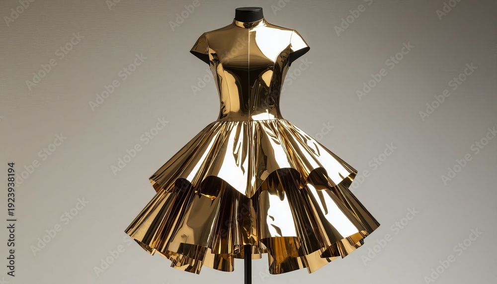 The display features a shiny gold dress on a mannequin. This striking gold dress has a flared skirt and a high collar, showcasing its metallic fabric. #1923938194
