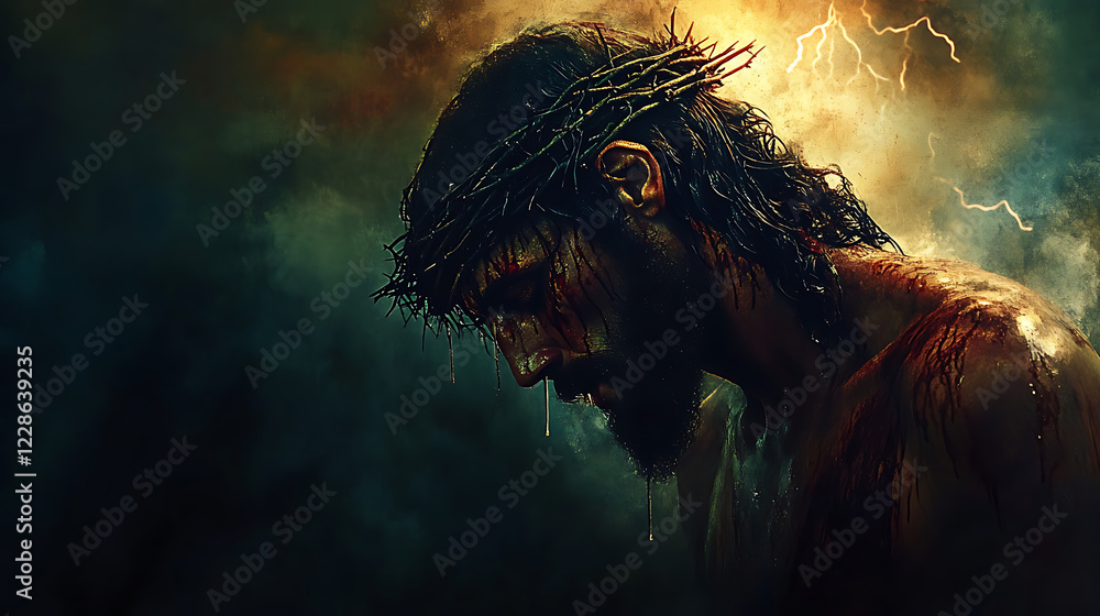 The final breath of Jesus on the cross, dramatic shadows enveloping His figure, faint lightning illuminating the darkened sky, the scene saturated with sorrow and cinematic tension, #1228639235