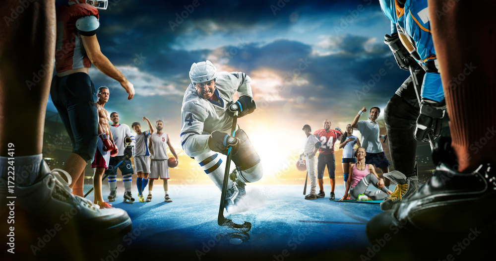 The multi sports collage including boxing, ice hockey, basketball, cycling, soccer, american football, fitnes, gym, baseball, volleyball with ice hockey player in the main role on the grand arena #1722241419