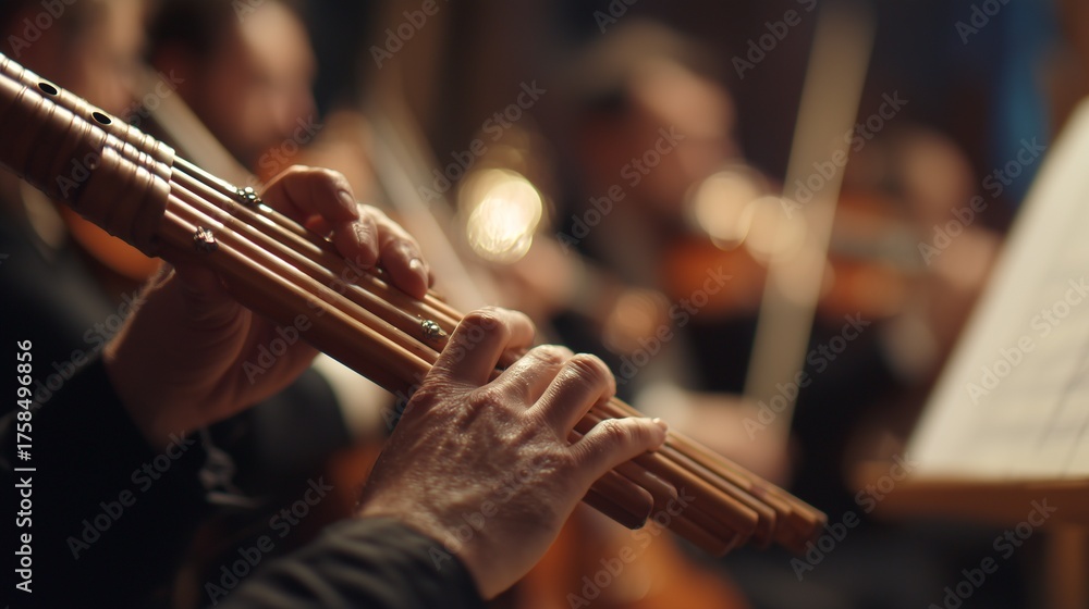 The musician plays the flute while the orchestra supports the flute. The musician and flute combine harmoniously as the orchestra enhances the flute's melody. #1758496856