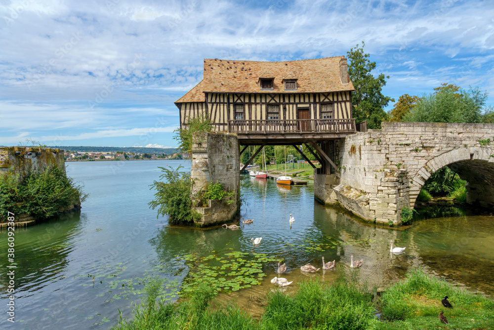 The Old mill (le vieux moulin) on the Vernon broken bridge on Seine river with swans in the foreground- Vernon, Normandy, France #386092387