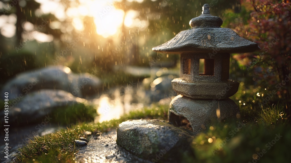 The stone lantern sits quietly by the stream, while the stone lantern reflects the gentle sunlight. Raindrops fall around the stone lantern, enhancing the serene garden atmosphere. #1745139840