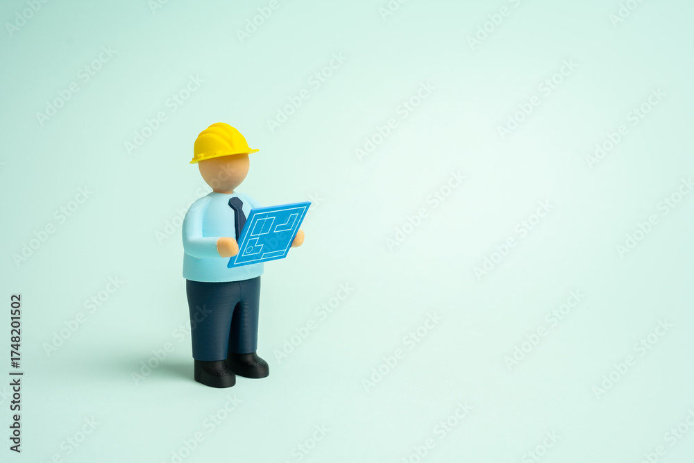 The working designer looks at the blue prints. Construction and design. A concept of project planning, creativity, and technical precision. Topics on architecture, engineering, innovation in design. #1748201502