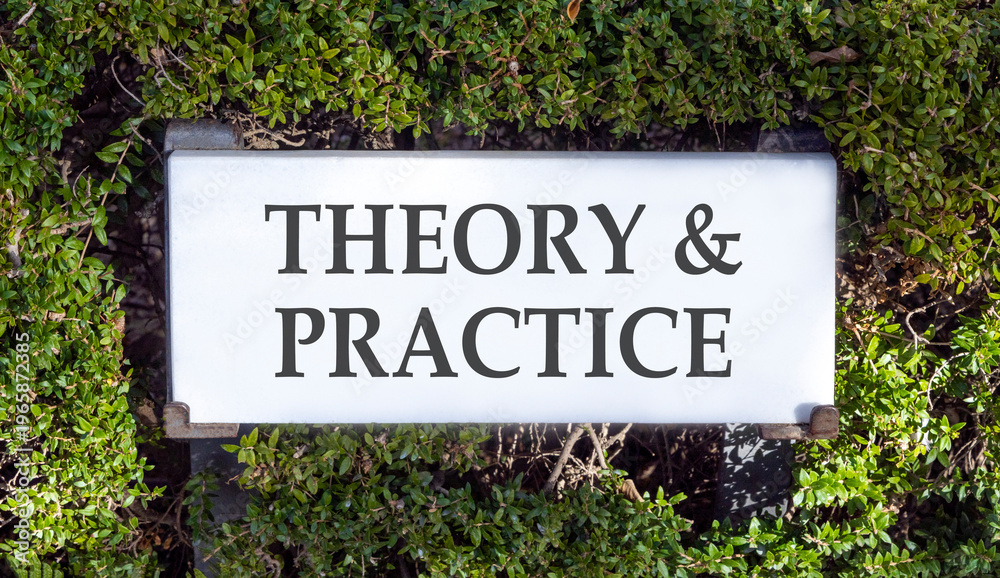 Theory and practice symbol. Concept words Theory and practice on beautiful big white sign plate. Beautiful green garden background. Business theory and practice concept. Copy space. #1965872385