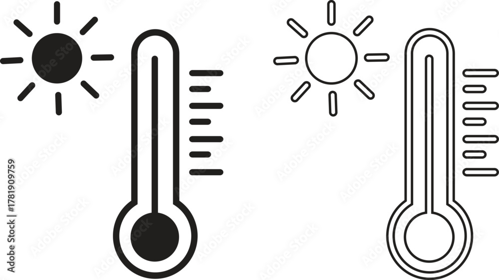 Thermometer icon set showing hot weather, temperature rise, heatwave, summer climate control, sunlight and warm indicator symbol, heat measurement tools in black flat and outline vectors illustration. #1781909759