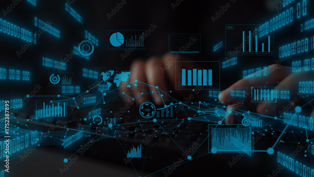 This image showcases a hands-on keyboard in a digital environment, surrounded by interactive charts and data visualizations that depict current business trends and analytics. Xenic #1752387895
