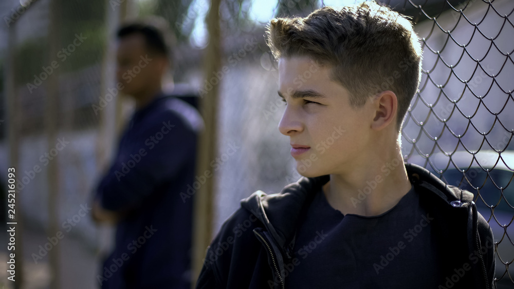 Thoughtful teen boys leaning on metal fence, upset with future, orphanage #245216093