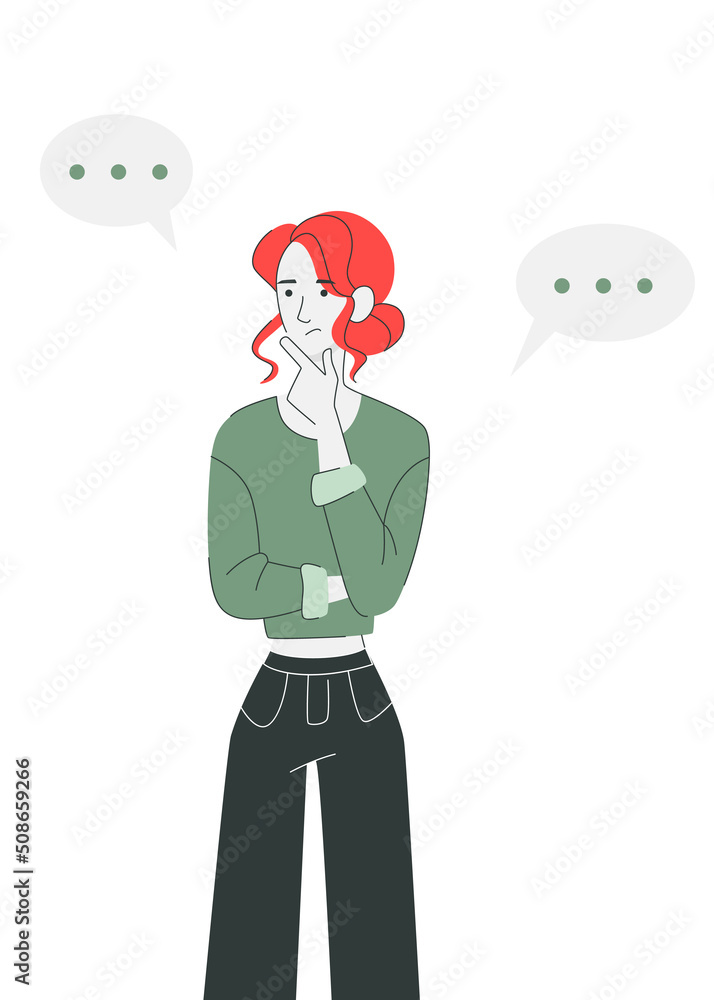 Thoughtful woman is discussing the issue. Gesture "thinking". Isolated illustration of young woman. Dialogue clouds. #508659266