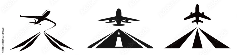 Three distinct aviation symbols depict an airplane taking off, an airplane in flight, and a runway. These designs reflect motion and the world of aviation clearly. #1736271029