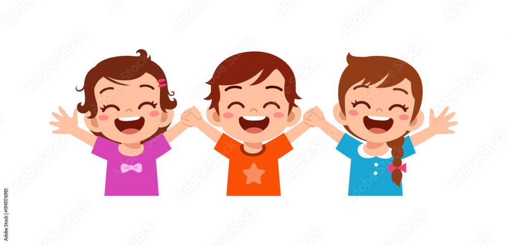Three happy children smiling widely laughing with hands raised holding hands together #1941176981