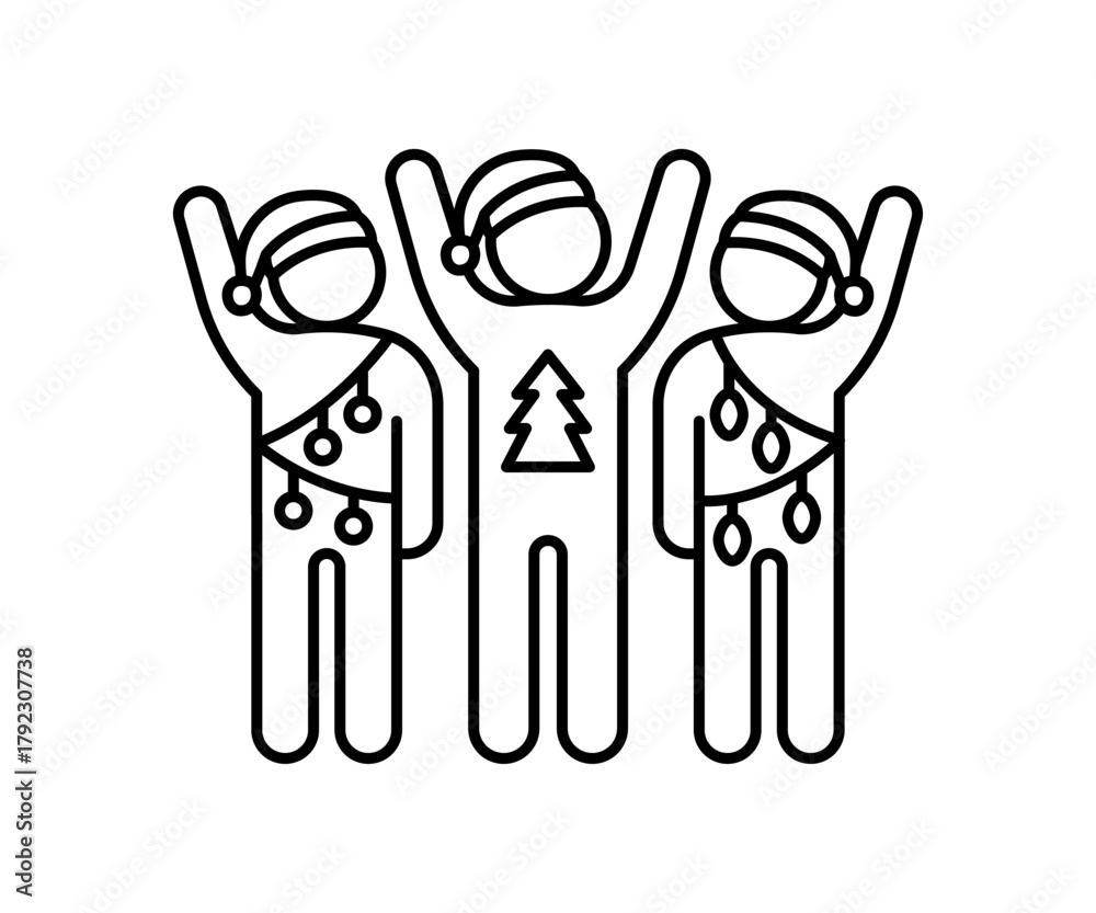 Three people with Santa hat and decoration, representing friendship and festive celebration. Partner support for holiday or Christmas greeting. Vector line illustration #1792307738