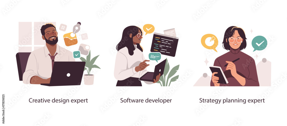 Three vector illustrations of modern business roles—creative designer, software developer, and strategy planner—working with digital tools and analytics. #1718316125
