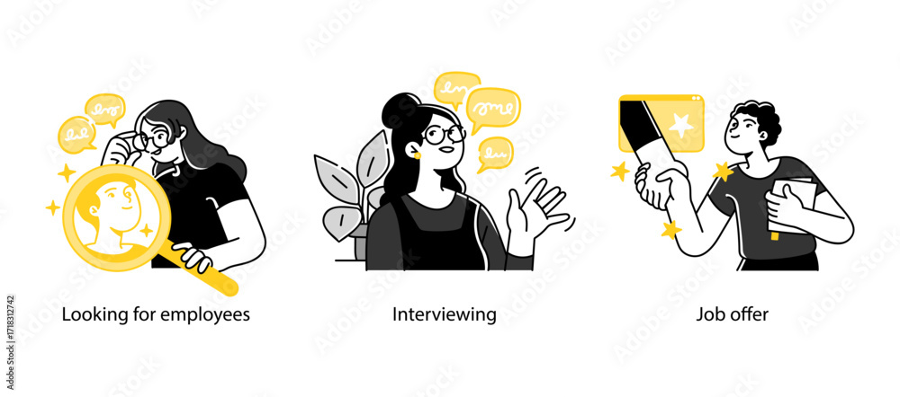 Three vector illustrations showcasing stages of hiring: searching for employees, conducting interviews, and extending a job offer to candidates. #1718312742