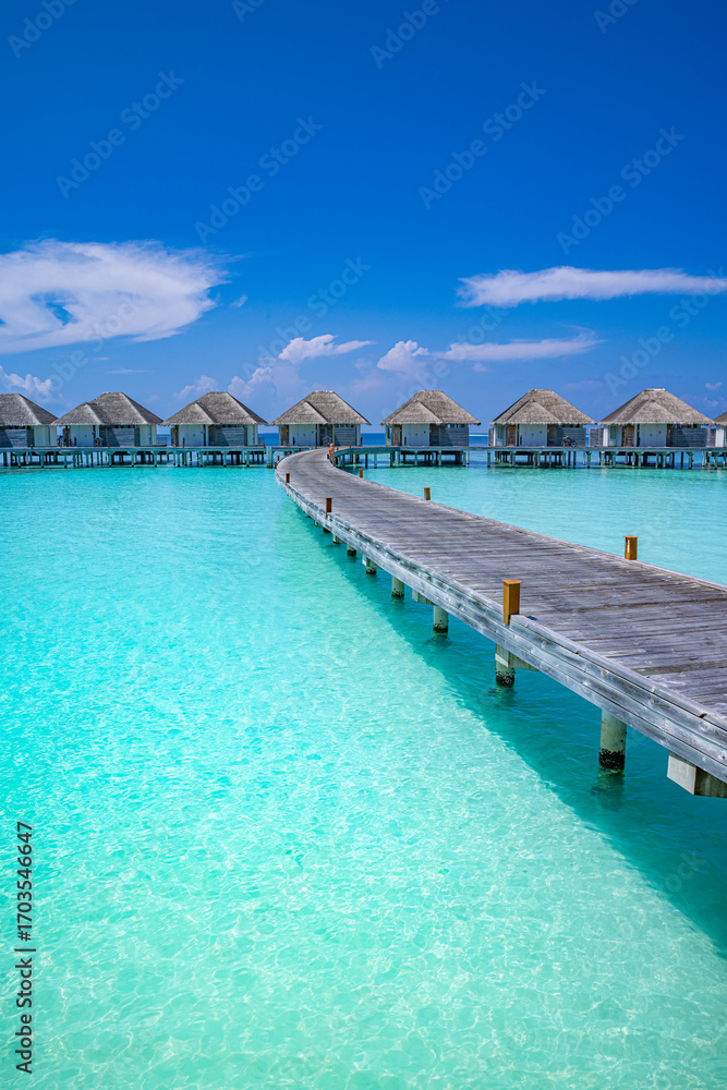 Top luxury water villas in Maldives islands under sunny blue sky with amazing ocean lagoon, tropical paradise resort and scenic summer vacation destination for travel, tourism relaxation inspiration #1703546647
