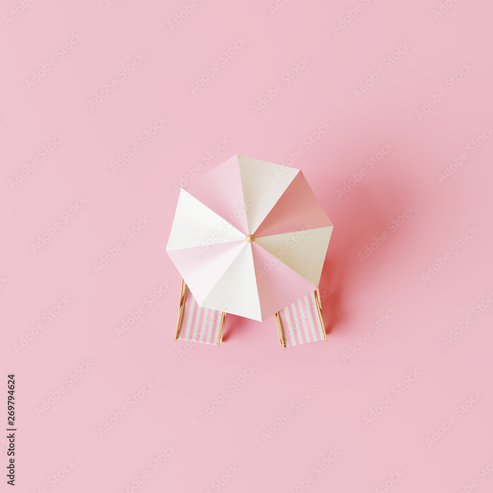 Top view Beach umbrella with chairs on pastel pink background. summer vacation concept. 3d rendering #269794624