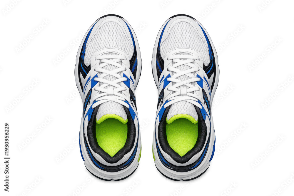Top view of white athletic running shoes with blue accents and bright green insoles #1930956229