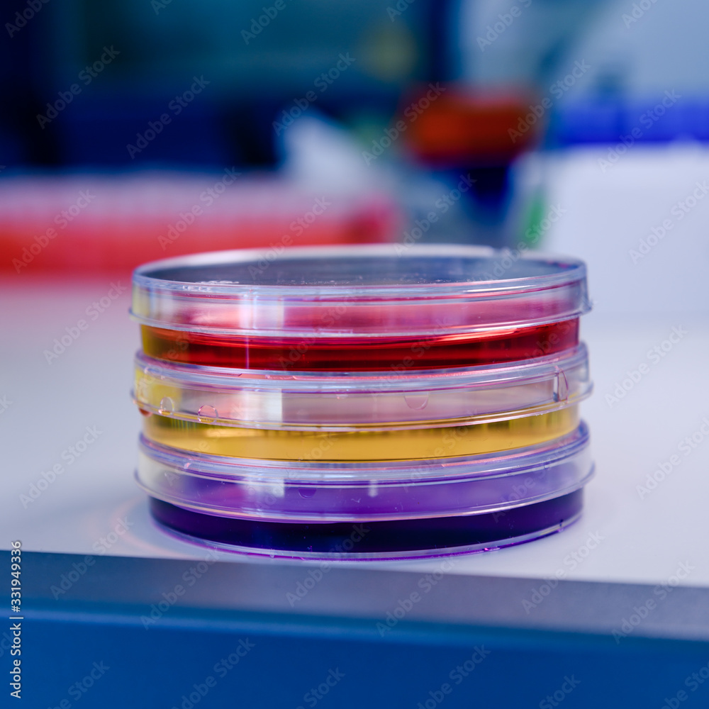 Tower of petri dishes with different dyes and tests. Concept of science, laboratory and study of diseases. Coronavirus (COVID-19) treatment developing. #331949336