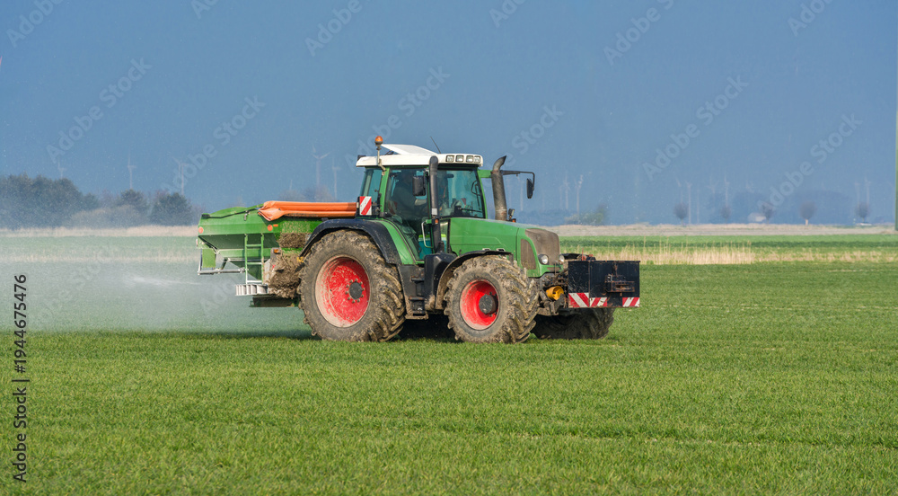 Tractor spreading fertilizer in spring on a grain field #1944675476