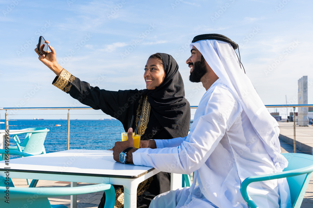 Traditional arab couple wearing emirati clothing dating outdoors #1664909966