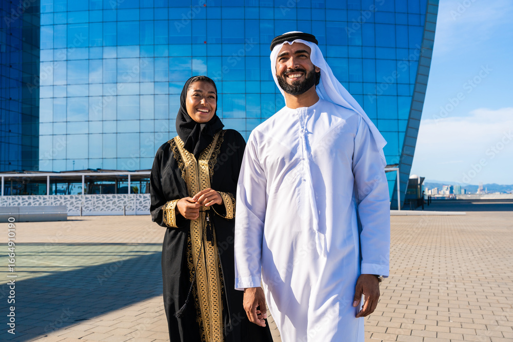 Traditional arab couple wearing emirati clothing dating outdoors #1664910190