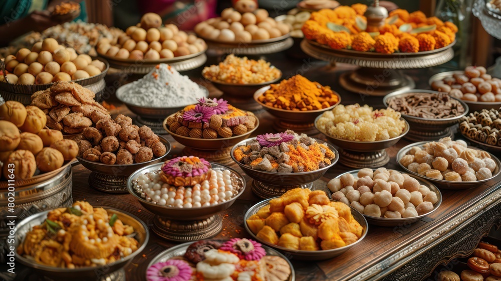 Traditional Indian sweets and dishes beautifully arranged on the table. It showcases the delicious food associated with Diwali celebrations. #802011643