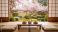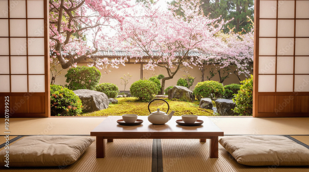 Traditional Japanese room with tatami mats and shoji screens overlooking a beautiful zen garden with blooming cherry blossoms in spring. #1920789925