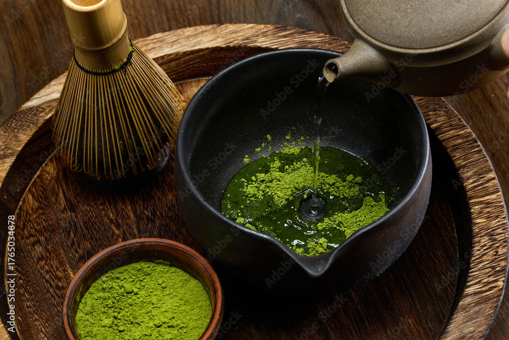 Traditional Matcha Preparation. High-angle view of matcha tea being prepared with a bamboo whisk #1765034878