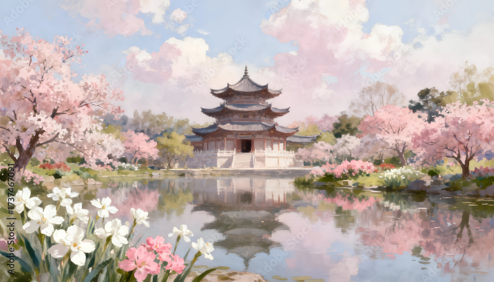 Traditional Pagoda Surrounded by Blossoms in Watercolor Painting S #1737467091