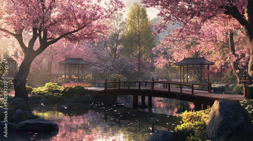 Tranquil Japanese garden with cherry blossoms and bridge. #962892370
