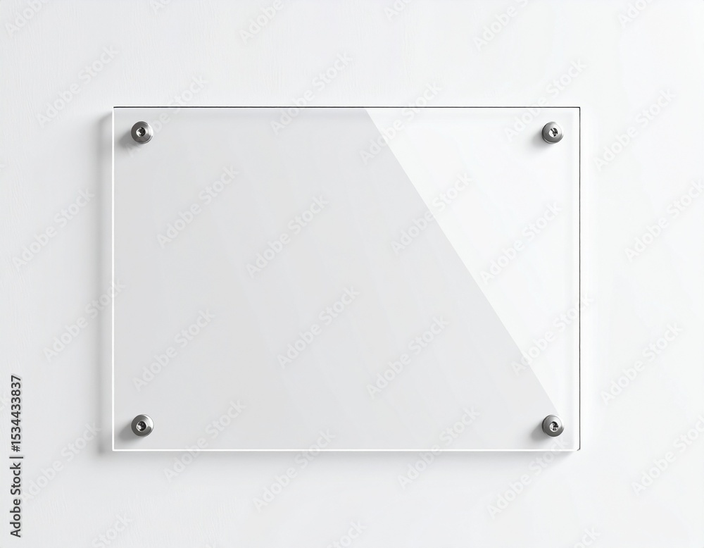 Transparent acrylic signboard with rounded corners, mounted with silver screws on a white wall, soft shadows and minimal clean design, perfect for modern branding or signage mockups #1534433837
