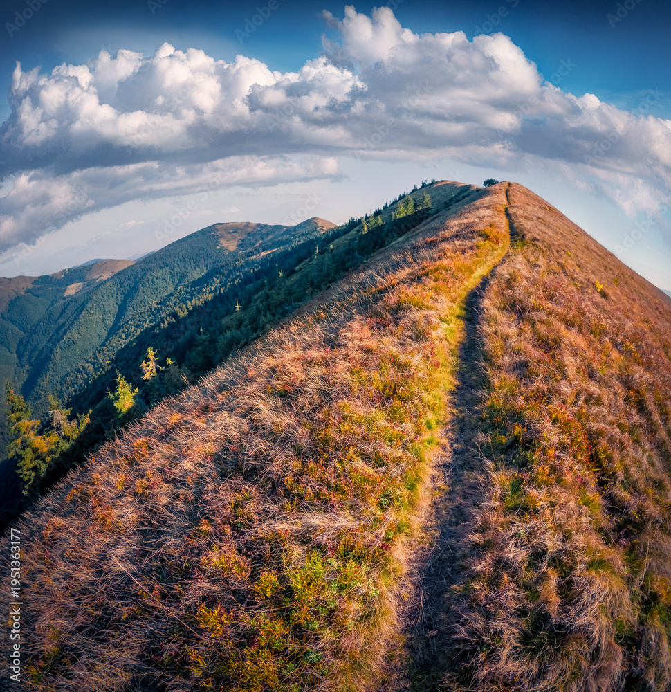 Trekking to the top of Darvaika Peak. Incredible autumn scene of Carpathian mountains, Ukraine, Europe. Beauty of nature concept background. Wide angle picture. #1951363177