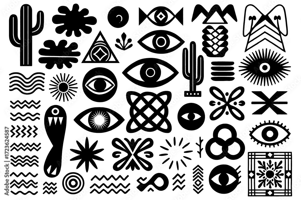 Tribal and mystical symbol set with eyes, cactus, and abstract shapes in bold black style, Transparent Background #1723624587