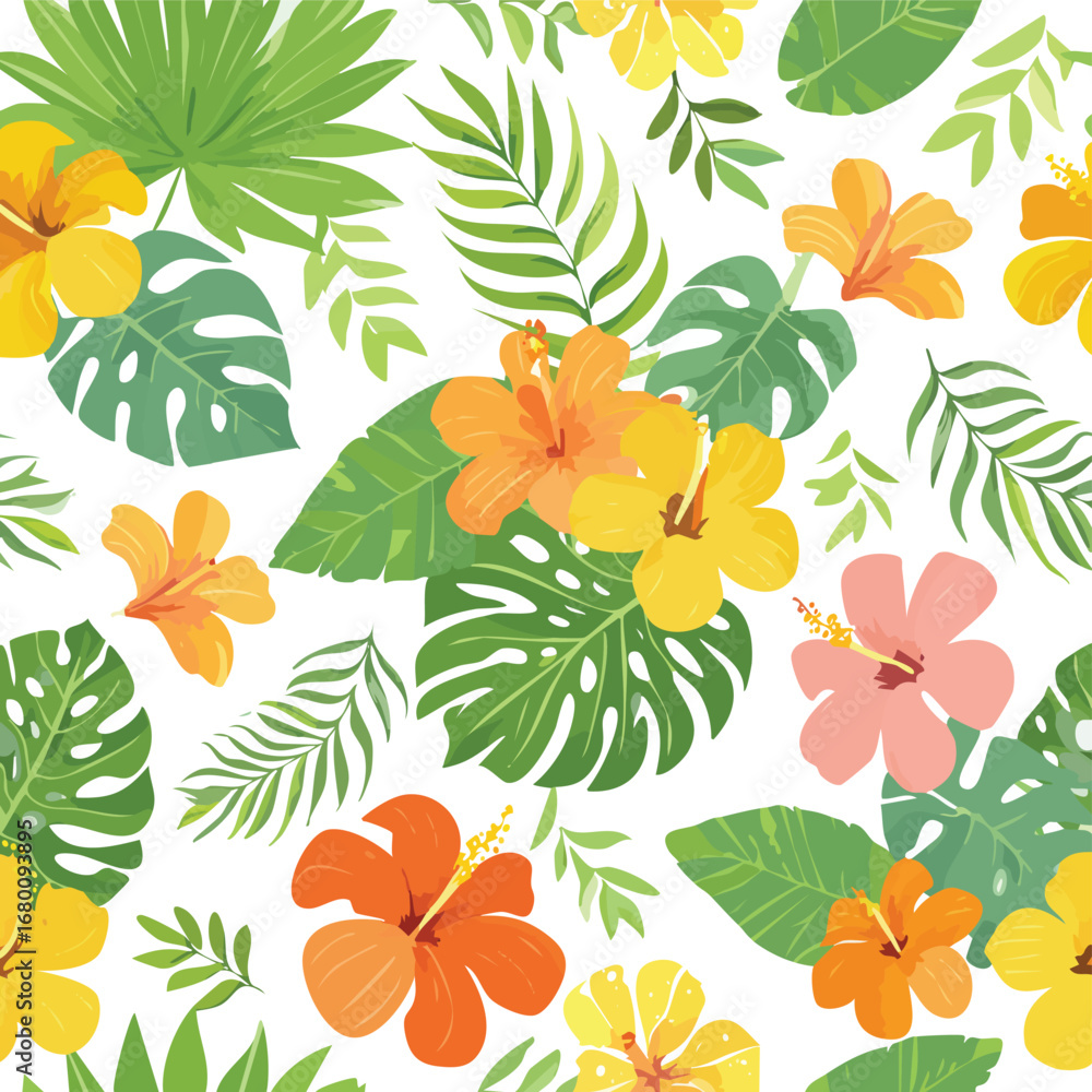 Tropical Hibiscus Flowers and Palm Leaves Seamless Pattern floral #1680093895