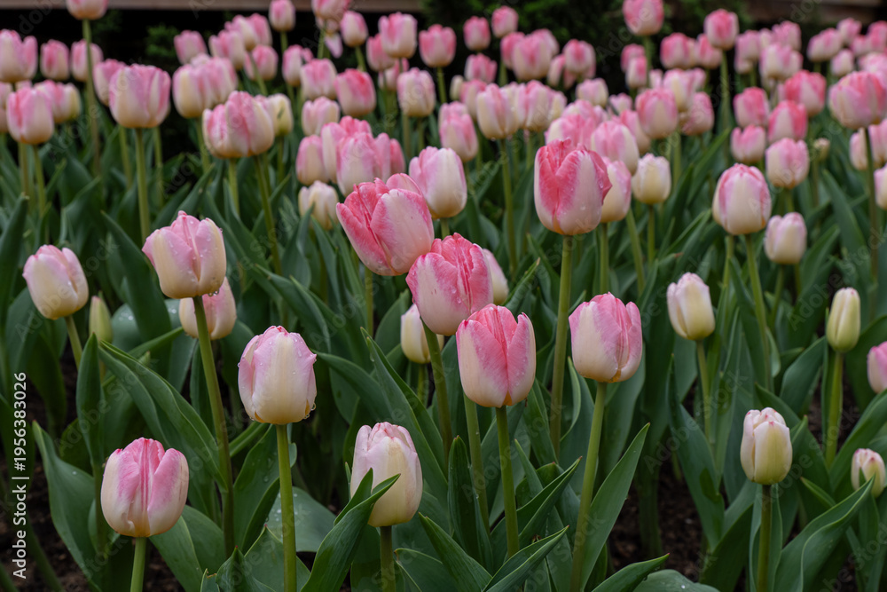 Tulips bloom in park during spring near city center with green stems and pink flowers #1956383026