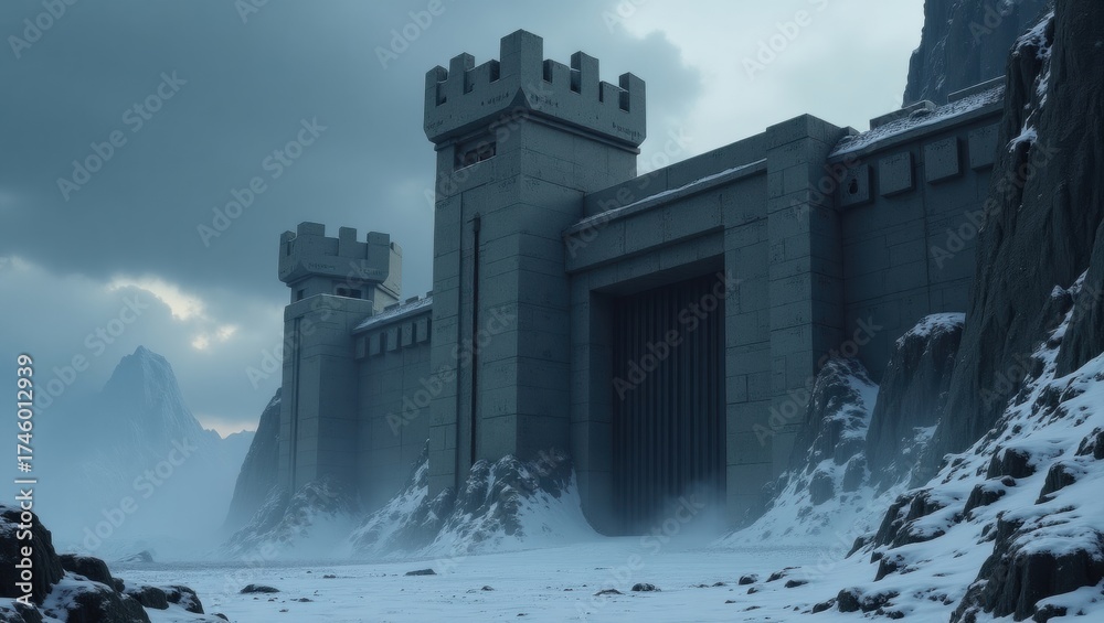 Tundra fortress braced against filled sky, surrounded by icy cliffs and mechanical guard towers #1746012939