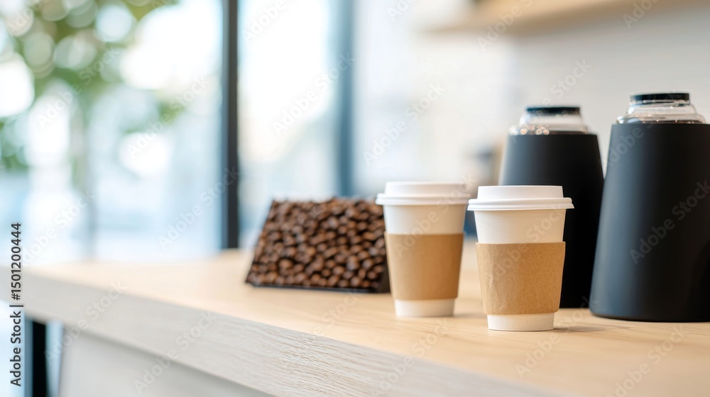 Two disposable coffee cups with sleeves on a cafe counter next to coffee beans and coffee dispensers. Concept of coffee break, cafe culture, morning routine. #1501200444