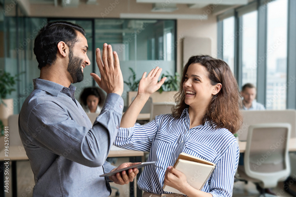 Two happy friendly diverse professionals, teacher and student giving high five standing in office celebrating success, good cooperation result, partnership teamwork and team motivation in office work. #1962576911
