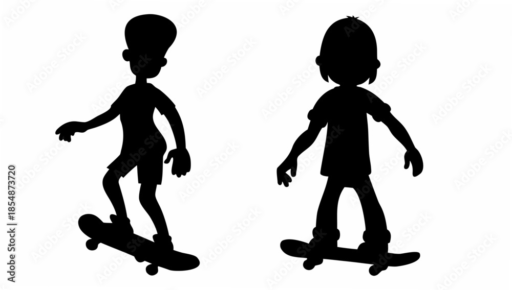 Two kids skateboarding in black silhouette on white background #1854873720