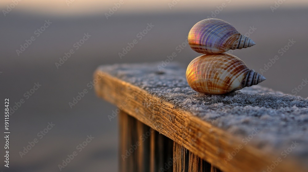 Two polished iridescent seashells balanced precariously on a weathered wooden surface, beautifully illuminated by the warm light of a serene sunset. #1911558422