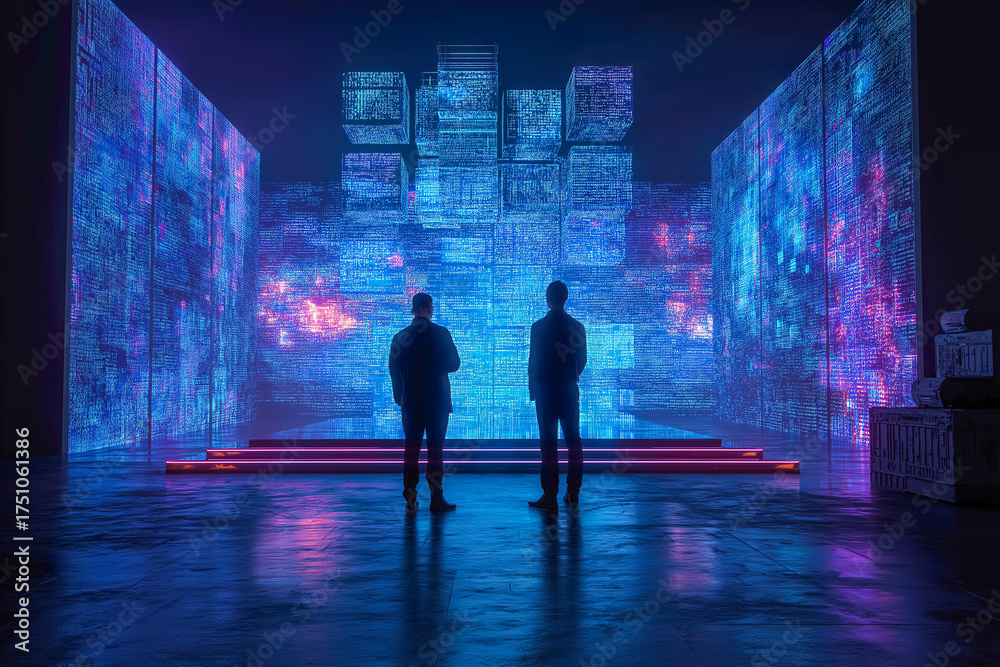 Two silhouettes observe vibrant light display in a digital art installation showcasing modern technology at a contemporary venue #1751061386