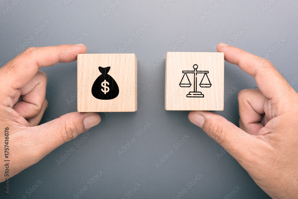 Two wooden blocks held by hands showing a money bag and justice scale representing the decision between profit and ethics in business and moral judgment #1757416076