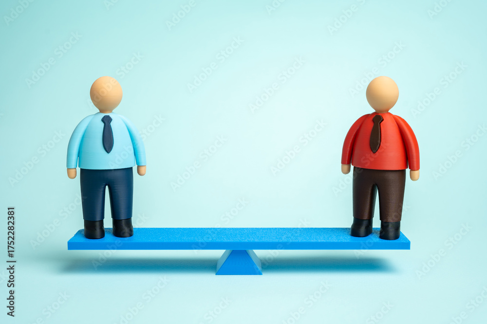 Two workers on a scale. Sales competition. Candidate selection. Business rivalry. Comparison of skills, performance evaluation, and workplace inequality #1752282381