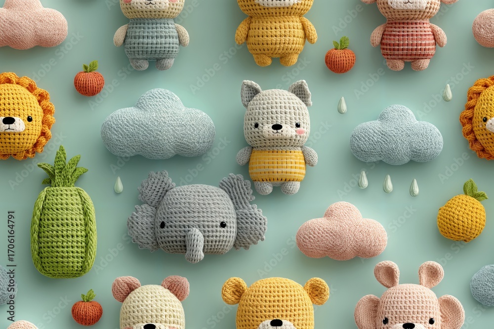 Un encantador mundo de amigurumis sobre un fondo verde menta. #1706164791