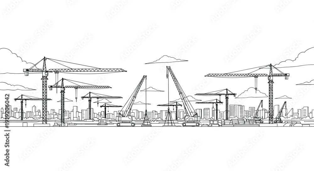 Urban construction scene with tower cranes and city skyline in black and white outline #1919206042