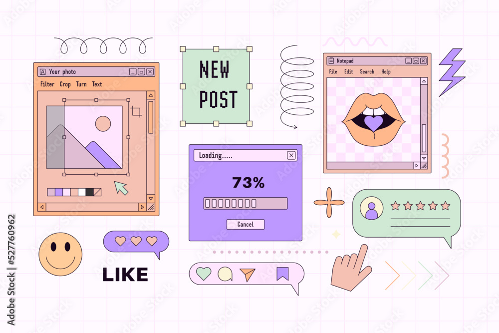 Vaporwave Template Boxes and Interfaces Elements. Retro Desktop with Frames . Vector Background Nostalgic for 90s #527760962